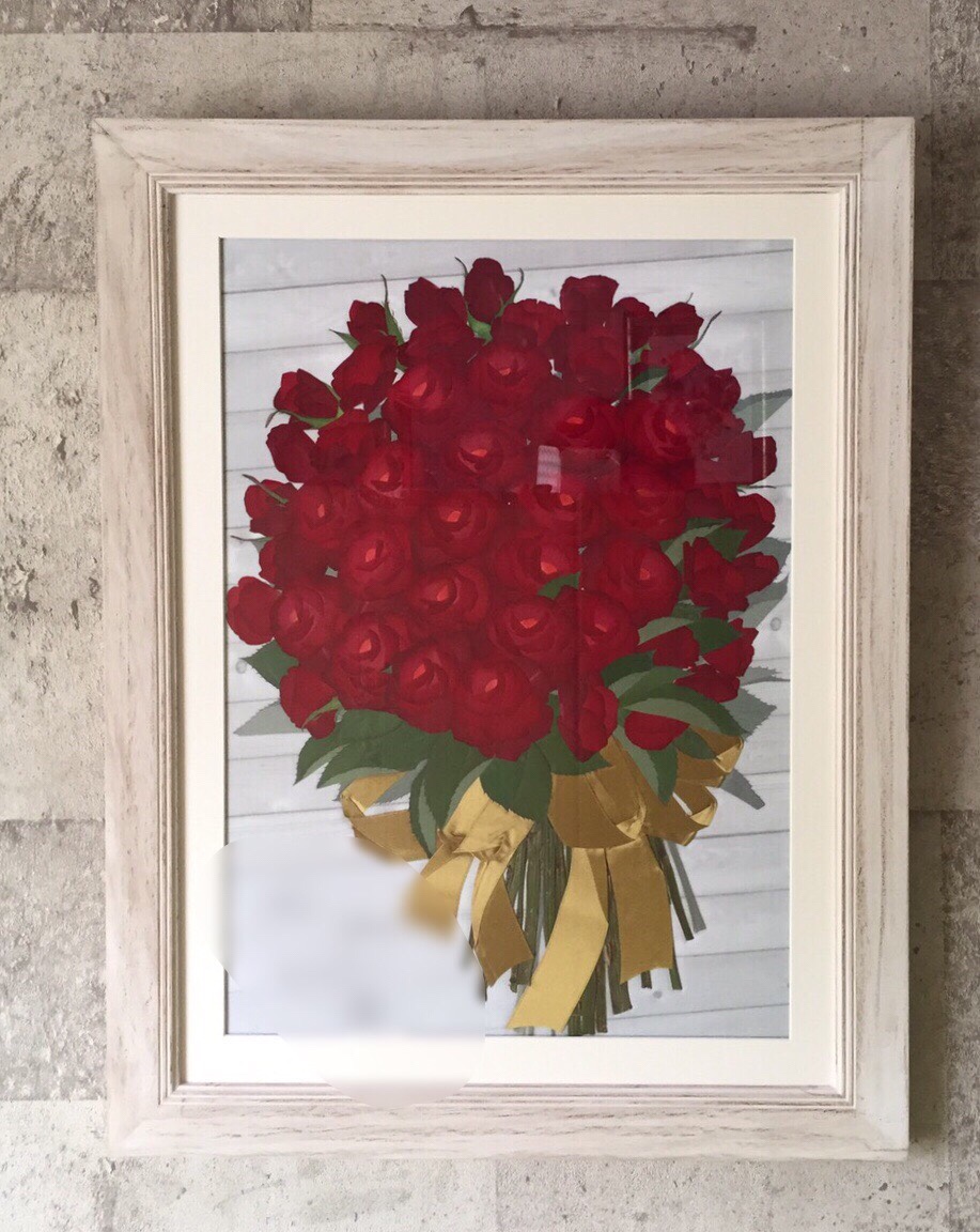 ナチュラルな額でとのご希望でしたので(HPにはなり特注の額です。)、ナチュラル額特大で、バラを沢山沢山🌹いれてあります。