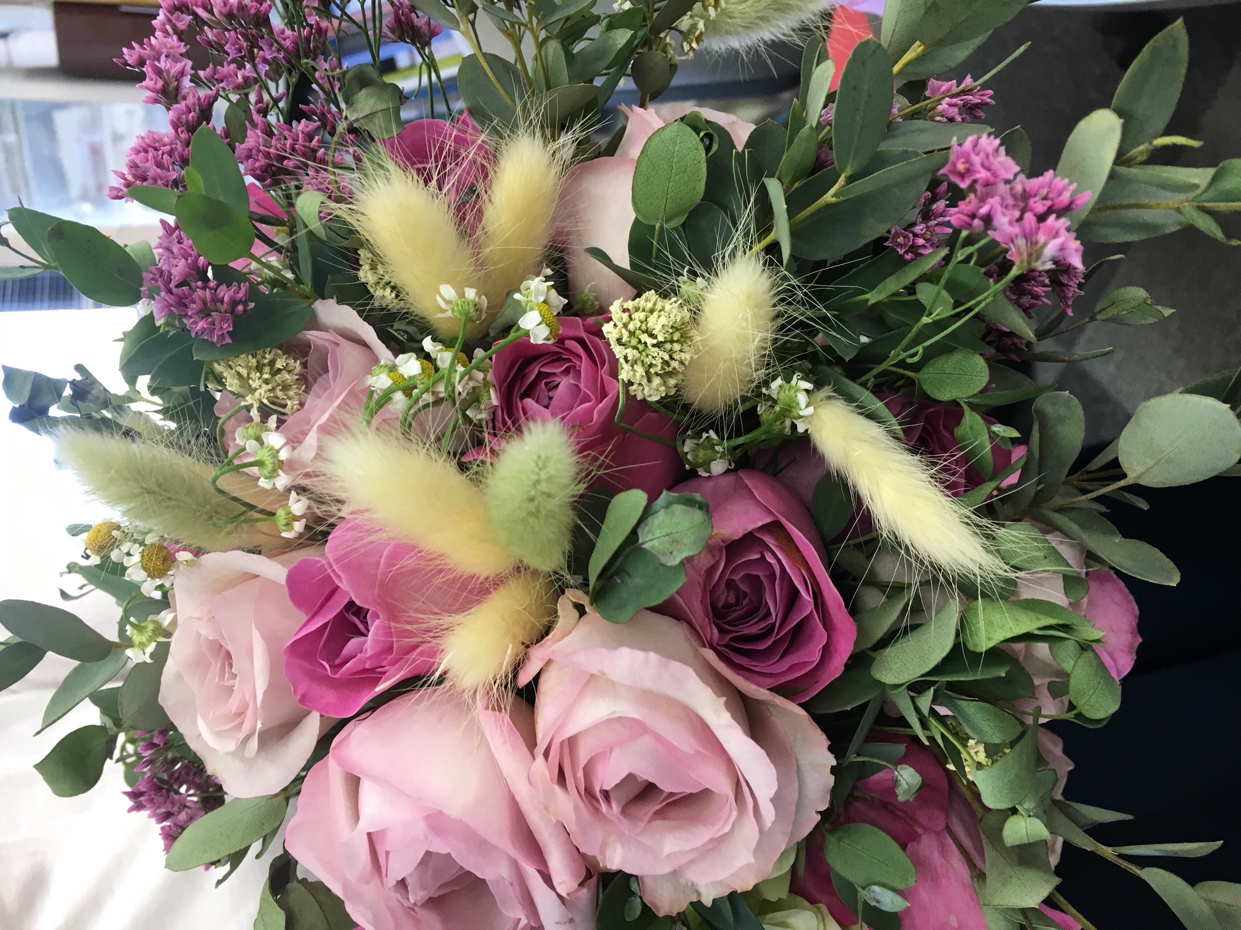 ピンク•パープルにナチュラルなラグラスをあしらったブーケ。