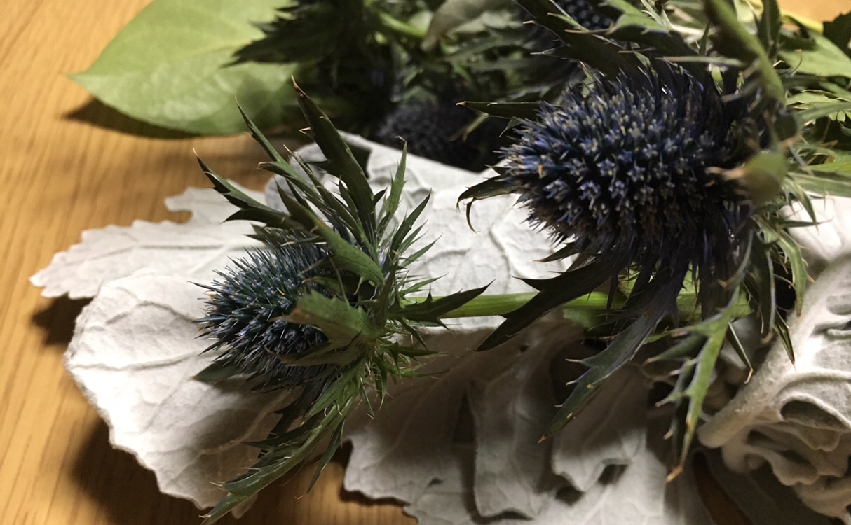 今日はこの紫のエリンジウムをあしらったブーケを加工しました