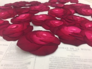 明るい赤・濃い赤の花びらをつくり、組み上げて、一輪のバラへ。