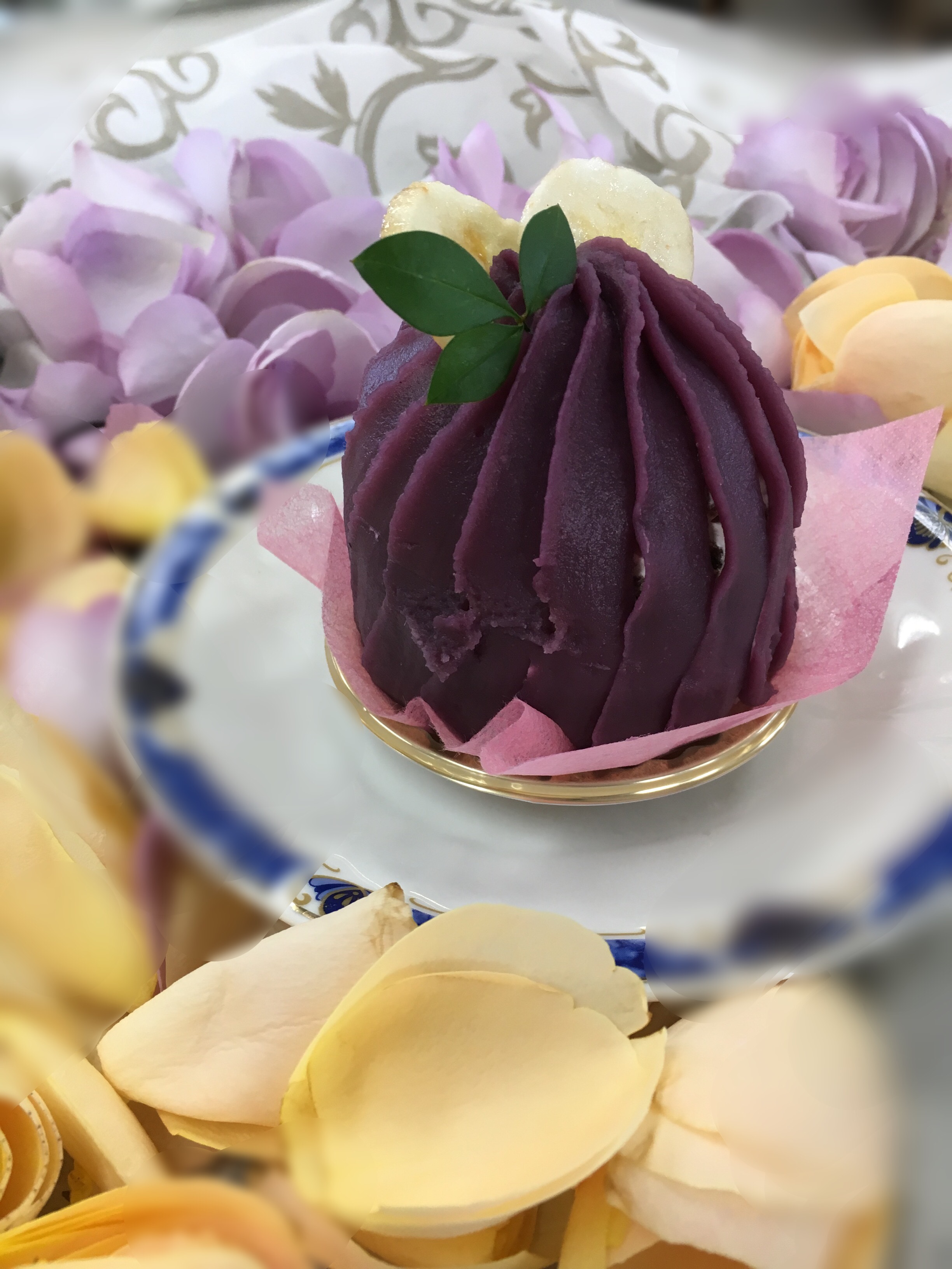 紫イモのスィーツ。11月生まれのマダムSの遅れ、遅れてのやっとの🎂バースデーケーキ。